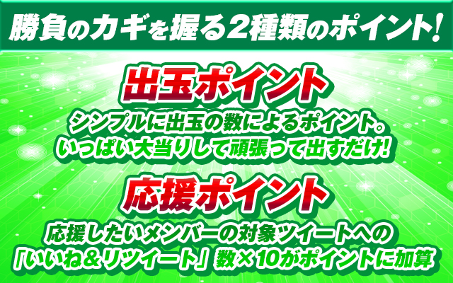 例えば毎回のバトルの勝敗で1勝2敗と負け越しても、全3回の出玉ポイントと応援ポイントの合計が相手を上回っていれば、チームとしては勝利となるルール。