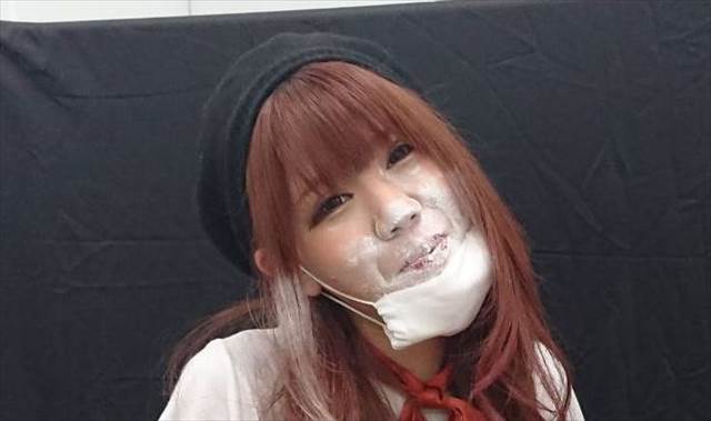 1、ひびき助手に白い粉を口に含んでもらい、マスクをしたまま咳をして粉の飛び具合を目視でチェック