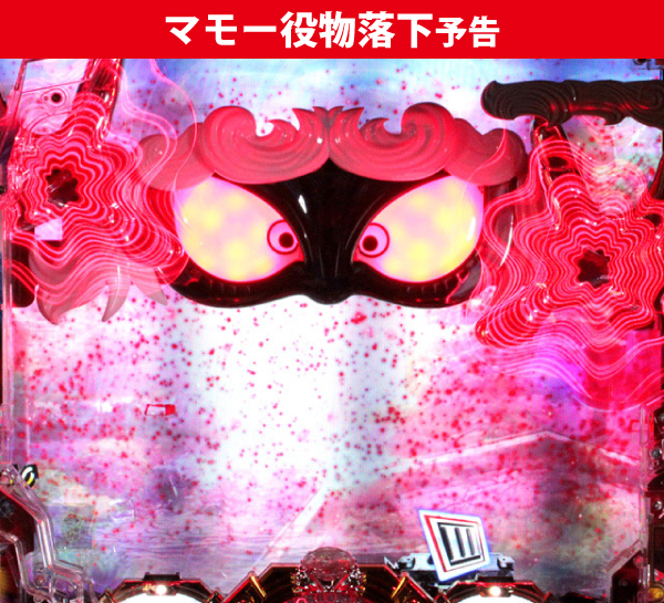 先読みや連続・ミッション系予告以外のリーチ前予告では「マモー役物落下予告」が23回と最多。手だけ落下と、顔&手落下の2パターンあり、後者の方が15回と出現頻度は高いが、最初は手だけ→戻システム予告→顔&手というパターンも少なくない。