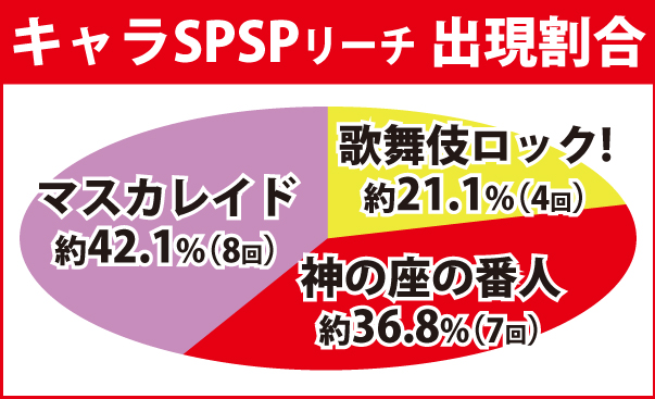 キャラSPSPリーチの場合、強or超あおり発生濃厚で、前述のとおり「マスカレイド」はすべて「超あおり」が発生。その他を見てみると、「歌舞伎ロック!」は強・4回のみ、「神の座の番人」は強・5回、超・2回と「超あおり」の出現回数は少なめだった。