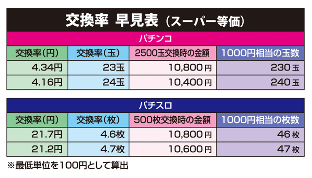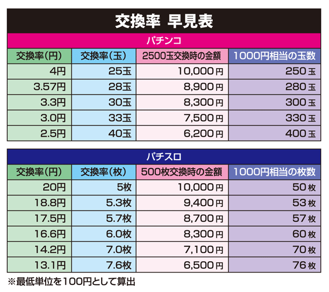 パチンコ・パチスロの主な交換率をまとめたものが以下の一覧表となります。