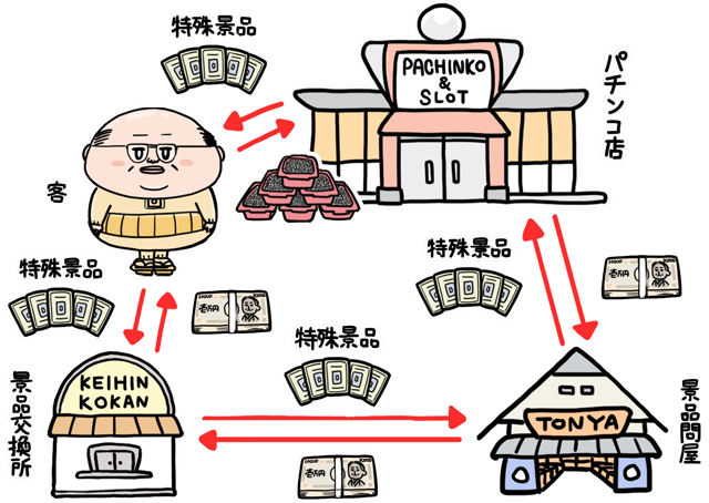 客はパチンコ店で遊技し、獲得した出玉を特殊景品と交換します。