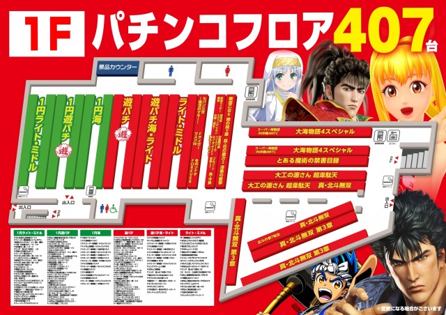 1F・パチンコフロアの設置台数は407台。そのうち、4円が284台、1円が123台と2レート営業となる。