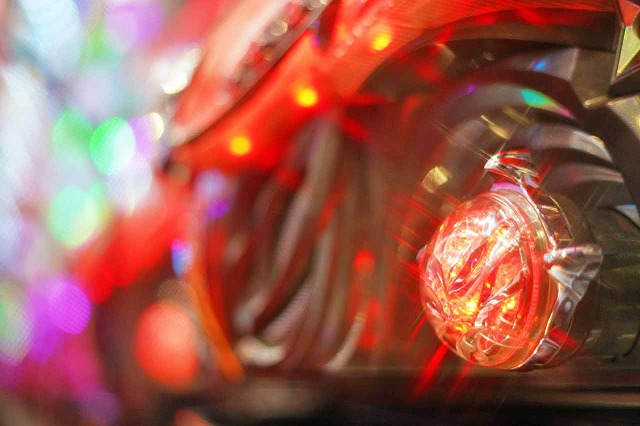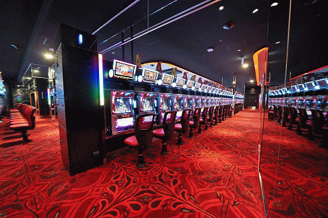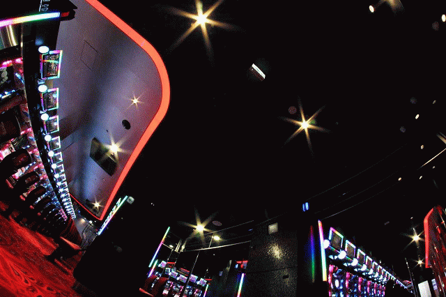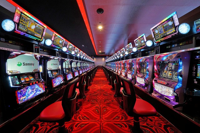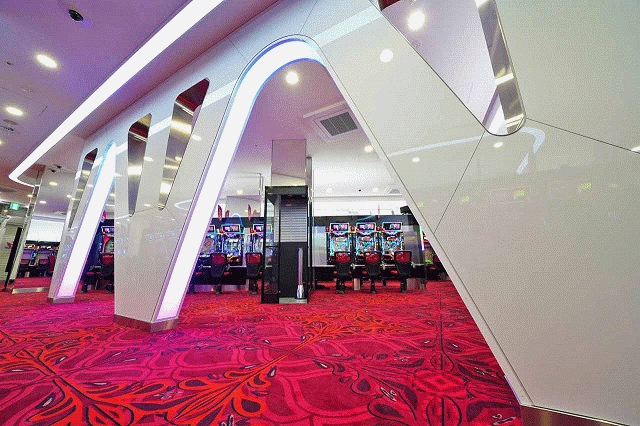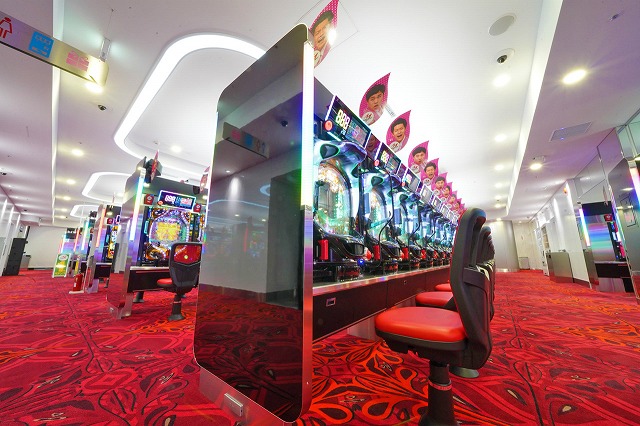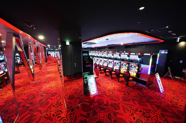 漆黒の壁面に、深紅のラインが印象的な2F・パチスロフロア。