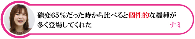 ナミ「末永く稼働していく機種かと思います。今年はパチンコが豊作の年だったかなと。遊タイム元年だったし、確変65%だった時から比べると幅広い個性を持った機種が多く登場してくれました」
