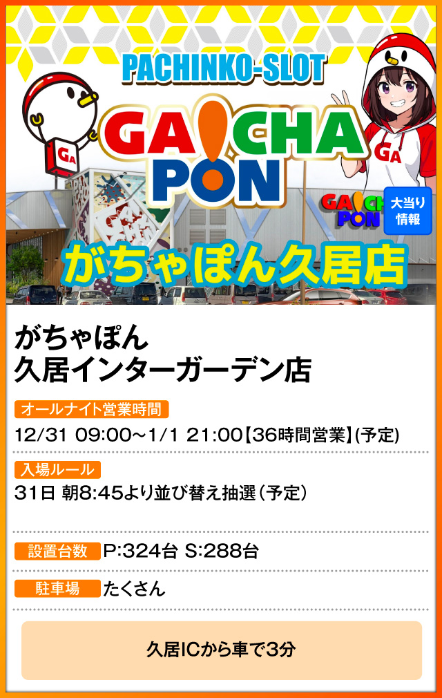 前置きが長くなりましたが、いよいよ2025~2026年の年越しでオールナイト営業を行う68店舗のホール情報を次々とお届け。ターゲットとなるお店を決めちゃいましょう。