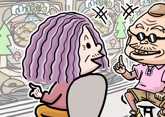 - 成人した孫と来店する老人