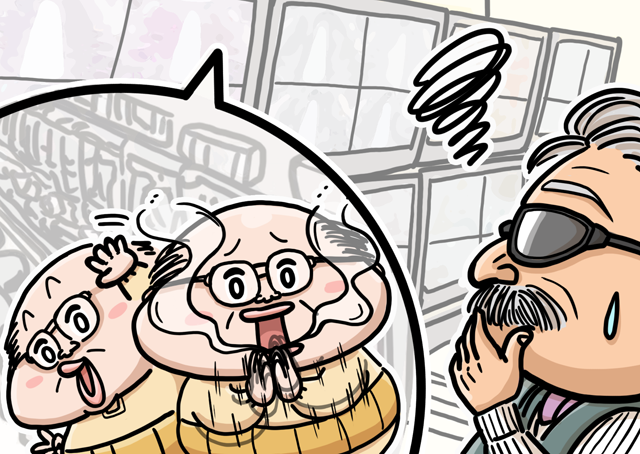 成人した孫と来店する老人のイラストです