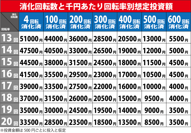 ただ、機種によって遊タイムの発動回転数が異なったり、その台が1000円ベースでどれくらい回るか、またお店の交換率にもよります。参考程度に『Pコードギアス 反逆のルルーシュ ライトミドルver.』の「消化回転数&千円あたりの回転数別想定投資金額」をご覧ください。