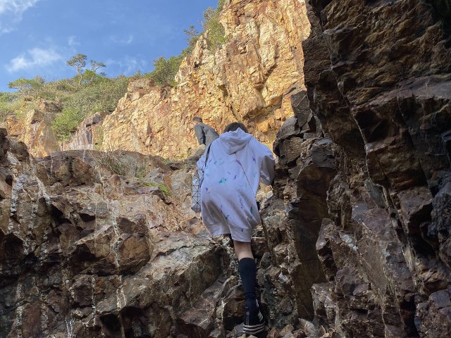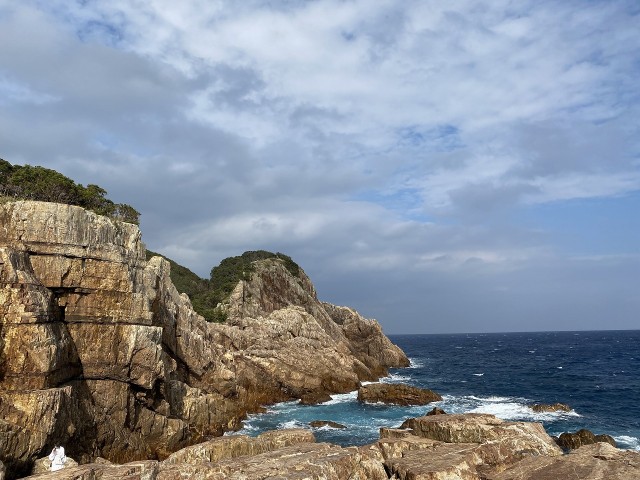 スイスイと進んでいくありしゃ~さんの後を懸命についていくと、辿り着いた先で雄大な自然が生んだ鉱脈と海風が一行を出迎えてくれた。