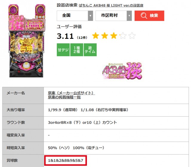 DMMぱちタウンにおける『ぱちんこ AKB48 桜 LIGHT ver.』を例に挙げると、賞球数は少ない方から並んでいるように見えて、最大の9が中盤あたりに表記されています。