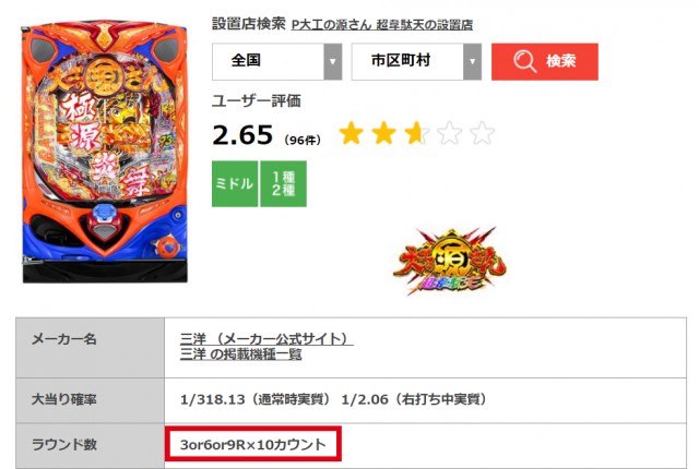 『P大工の源さん 超韋駄天』では、大当りは3or6or9R(=ラウンド)となり、10カウント(=玉が10個入賞)するごとに次ラウンドへ移行、最大9Rまで続く形です。