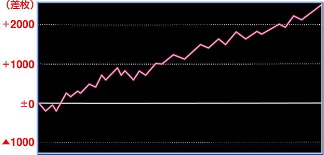 本機は確定系を除くと比較的判別要素が少なく、見抜きにくいのではと感じるが設定6に関しては別格。スランプグラフだと上画像のような安定したグラフを描くことが多い。