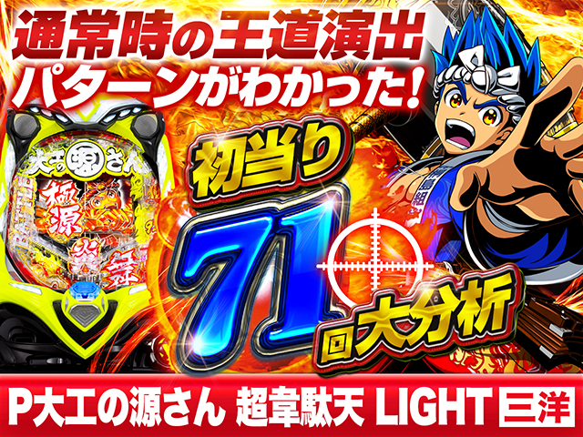 ミドルタイプで一世を風靡し、今なおホールの主力として活躍する『P大工の源さん 超韋駄天』に待望のLIGHTバージョンが登場。当たりやすくなったことで、より超源RUSH(以下RUSH)を身近に感じやすくなった本機で初当り71回による実戦検証を行い、初当りに絡みやすい王道演出を調査。さらに気になるRUSH突入率も徹底解剖していく。