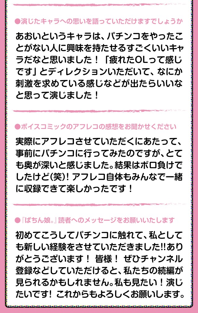 それを皮切りに順次公開されるボイスコミックは全3作。「パチンコ解説編1」を元にした第2弾、みどりも登場する第3弾が控えています。