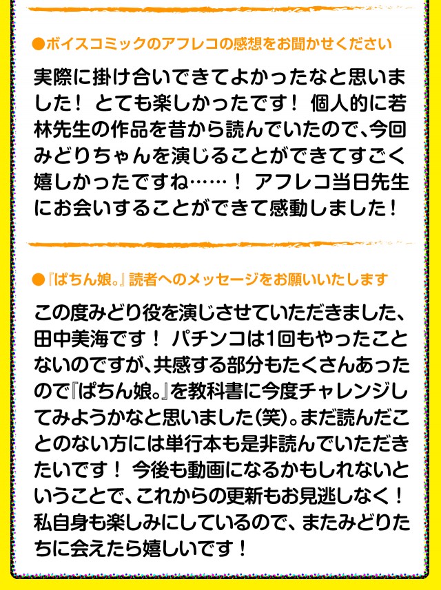 それぞれを演じていただいた芹澤優さんと田中美海さんから、『ぱちん娘。』へのアツい思いがビンビンに伝わってくるコメントが届いています。