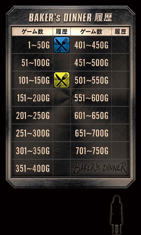 175G時にサブ液晶でベイカーズディナーの履歴をチェックし、右下にエヴリンのシルエットが表示されていれば(上画像参照)有利区間移行時の初期抽選での赤バレット獲得示唆となる。