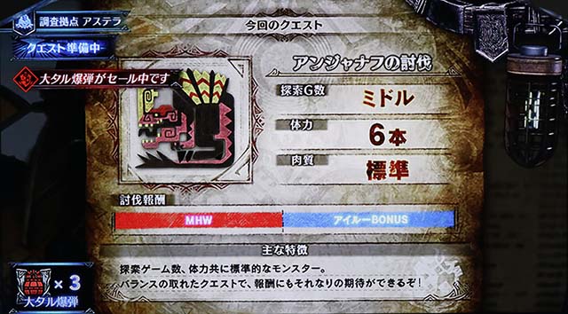 また、クエスト受注後は、選択されたモンスターによって討伐時の報酬(MHW or アイルーボーナス)の割合が変化するため、MHW割合の高い上位モンスターはスルー回数不問で狙うのもアリ。