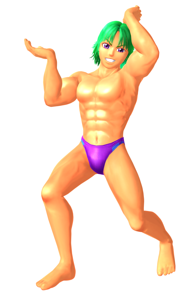 また、基本衣装は紫色の競泳パンツでムキムキのボディーが特徴。