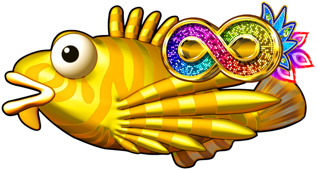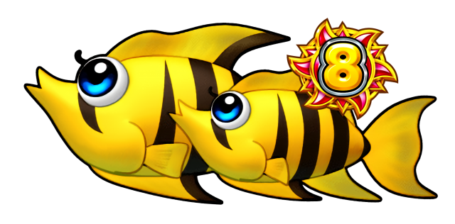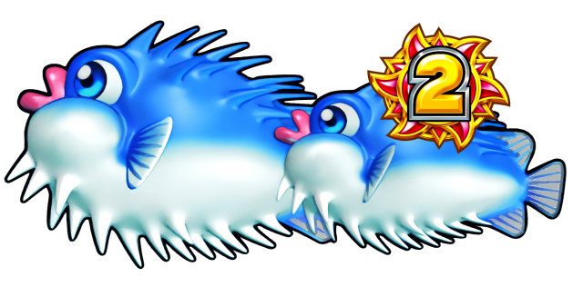 本物のハリセンボンは背中が茶色ですが、2図柄では青。ジュゴン・エンゼルフィッシュを含め、海物語シリーズでは親子の姿で登場しています。