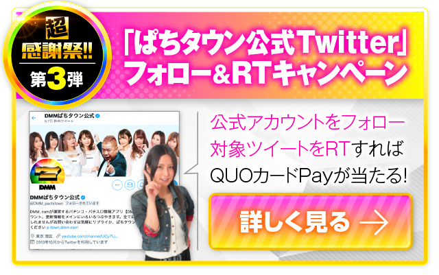 「DMMぱちタウン公式アカウント」をポチッとフォローして対象ツイートをポチッとRTするだけなので、ぜひ気軽にご参加ください!