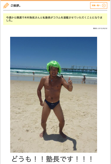 ちゃんとありました。神様、疑ってすみません。木村魚拓さんと塾長さんが交互にコラムを書くというスタイルだったんですね。塾長さんの元気な挨拶が印象的。