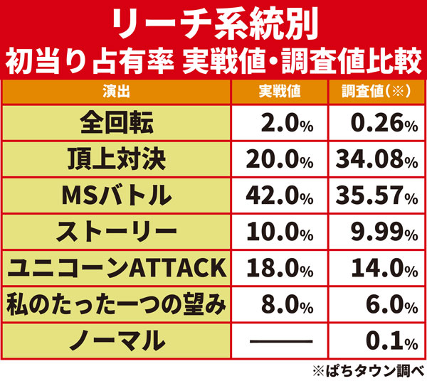 ここではぱちタウン調べの調査値(以下、調査値)と実戦値を比較。やはり赤い彗星の再来ゾーンとガンダムユニコーン予告は調査値でも低めで、可能性の獣と頂上対決リーチの割合が高い。