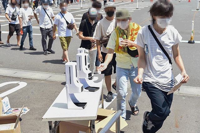 駐車場に備え付けの消毒マシンに1人1人が手をかざし、しっかり除菌してから入場。