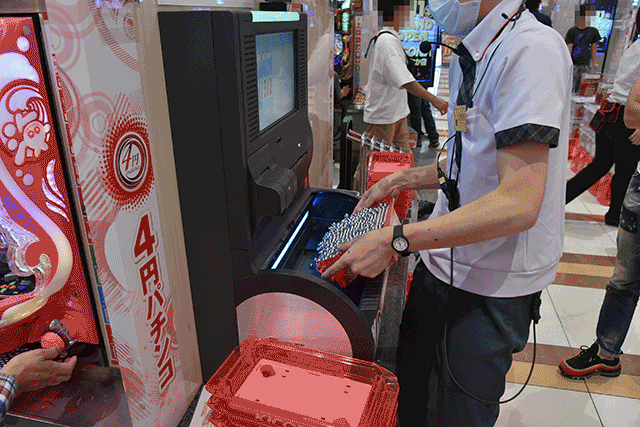信じられないほど大量の持ちメダルが、台上と通路に溢れんばかり。