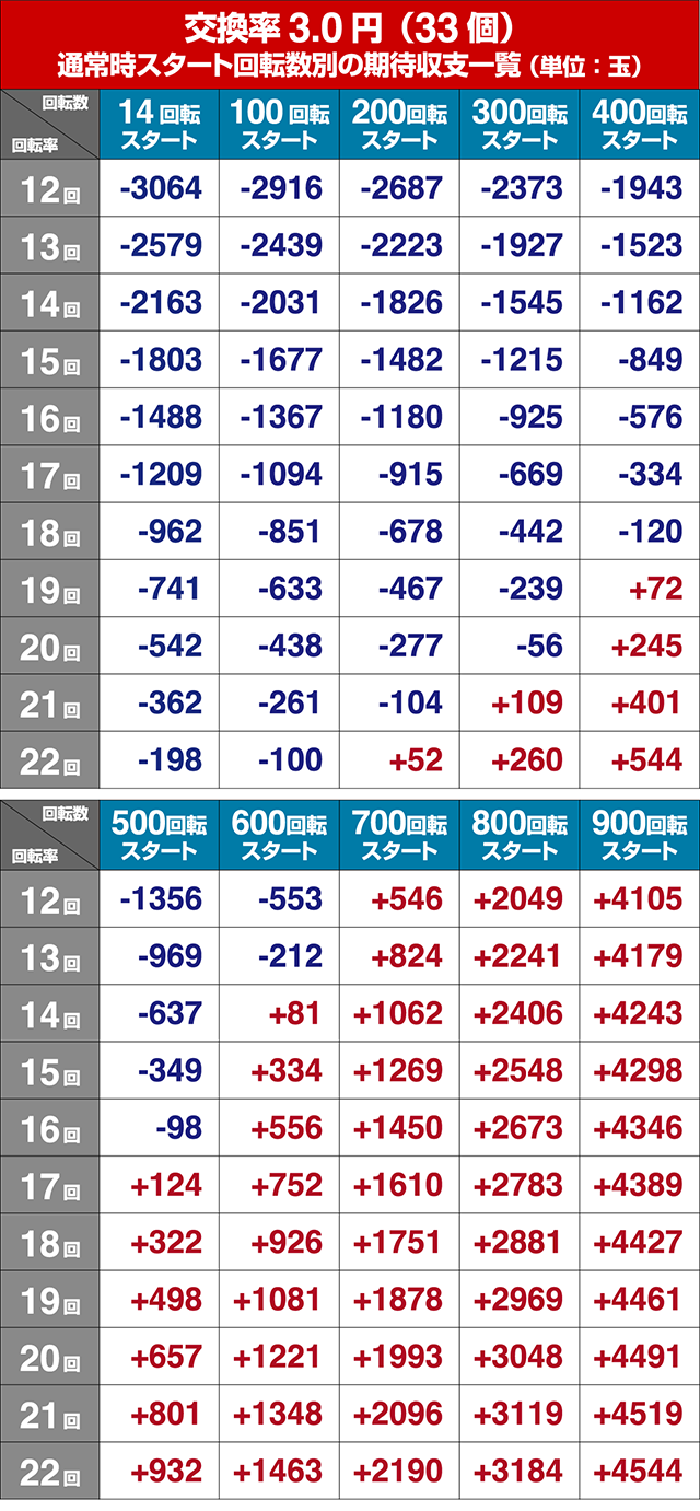 一方、3.0円交換以下の場合、残り回転数が半分を超えないとほとんどプラス域には届かないため、まずは「交換率」をしっかり把握するのが重要と言えます。