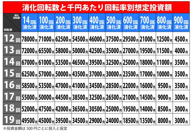 遊タイム到達までに要する投資金額を消化回転数と回転率別に想定した場合、以下のような計算になります。
