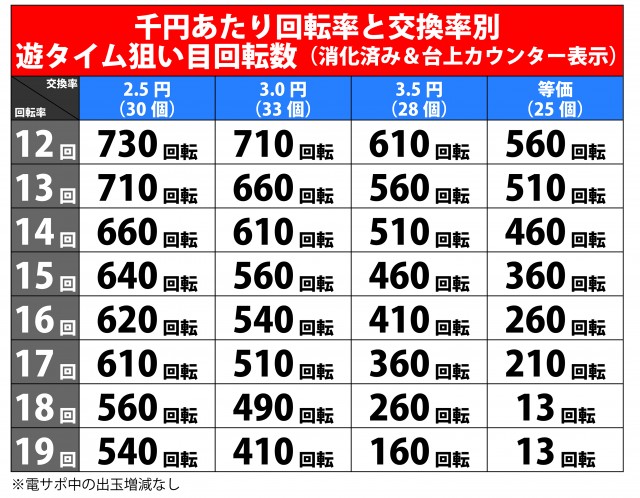 ここでは「千円あたりの回転率」と「交換率」別に、プラス収支が期待できる回転数の台=狙い目になる台の消化回転数をチェックしていきましょう。