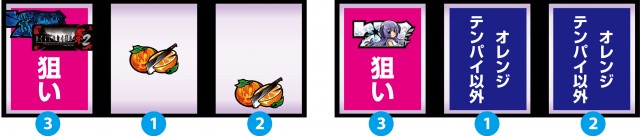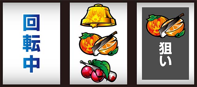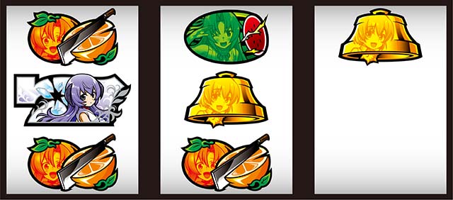 中リールにスイカを狙い、その後の停止形に応じて左リールを打ち分けよう。スイカの押し位置によってオレンジを引き込めない場合があるので中リールは青7狙いを推奨だ。
