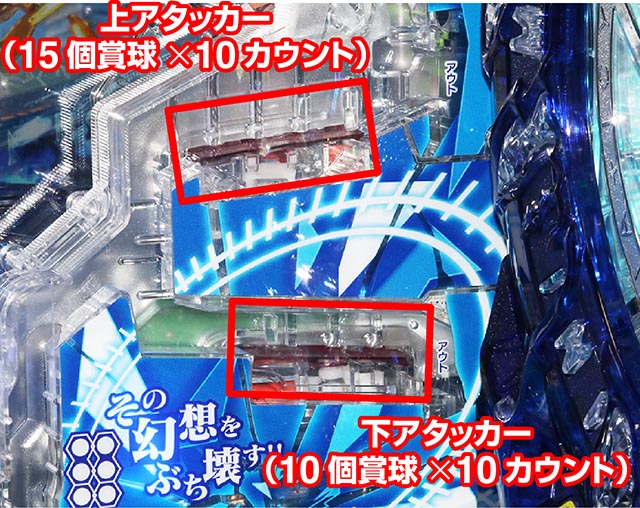 10R時に開放するのが上アタッカーで、賞球数は15と多くオーバー入賞時の効果は高い。実戦上では打ちっ放し時のラウンド間のコボレは3個前後。
