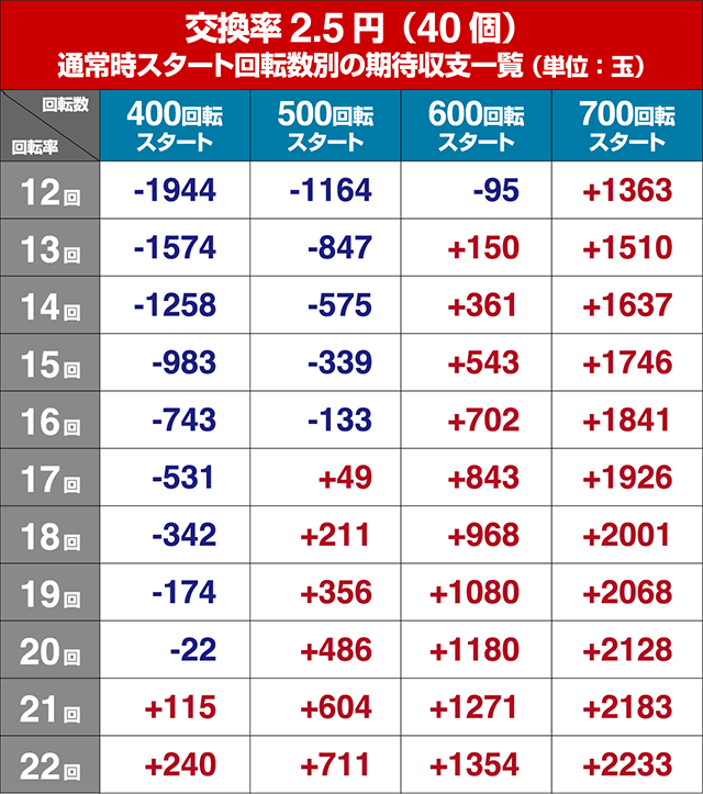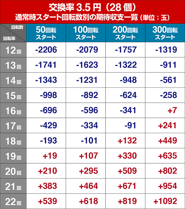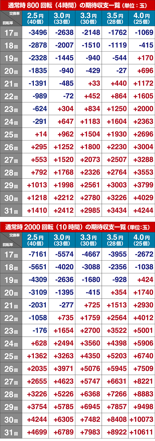 ※回転数あたりのプラス個数は交換後の1玉4円換算での値