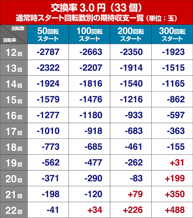 次は交換率・台の回転率・経過回転数別の期待収支に注目し、交換率ごとにプラス収支が期待できる狙い目回転数に注目していきましょう。
