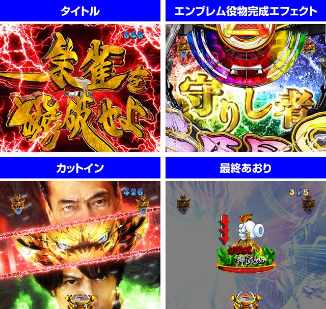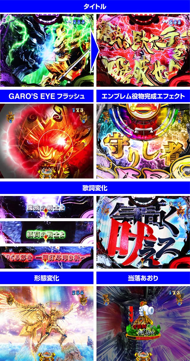なお、リーチ終盤カットインが赤(牙狼登場)なら信頼度上昇、エンブレム役物が完成した際のエフェクトが虹(守りし者)なら大当り濃厚だ。