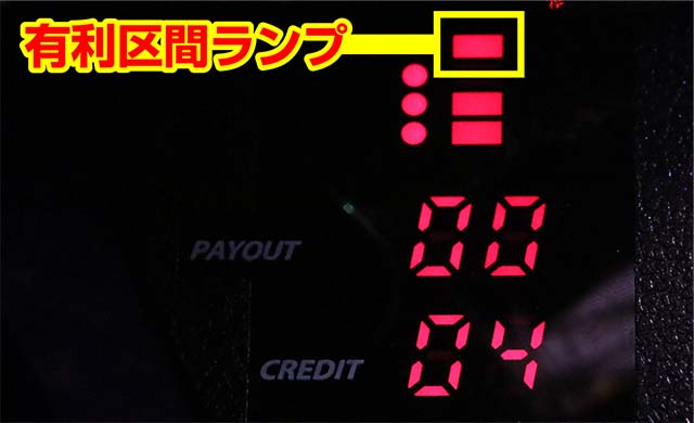 PAY OUTの上、一番上の四角型のランプが有利区間ランプ。通常時は基本的に消灯しているが、CZやATが終了しても点いたままなら次の当たりが近い可能性が高いので見つけた際は積極的に拾っていきたい。ただし、ライバルも多いため、そう簡単には拾えないことも頭の隅に入れておこう。