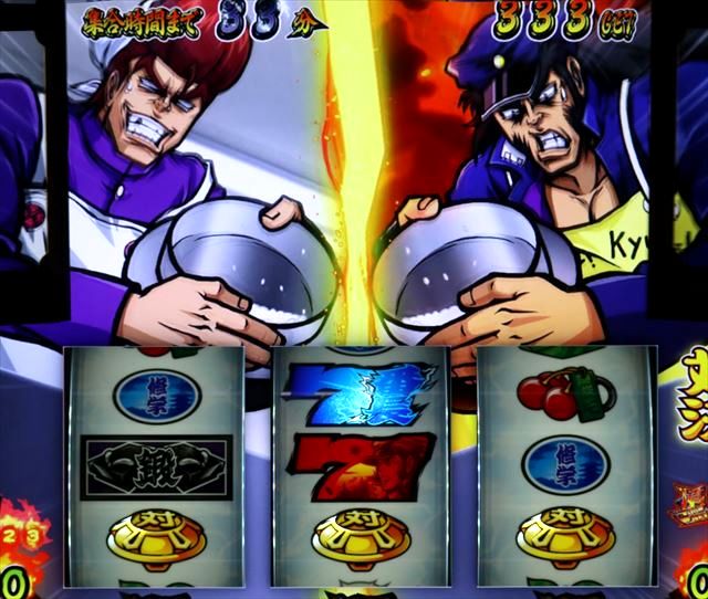 対決中にレバーON→予告音が発生したら基本的にベルorレア役となり、逆転勝利のチャンスとなります。が、逆に予告音でベル(取りこぼし含む)orレア役を否定した場合には、対決勝利が確定します。