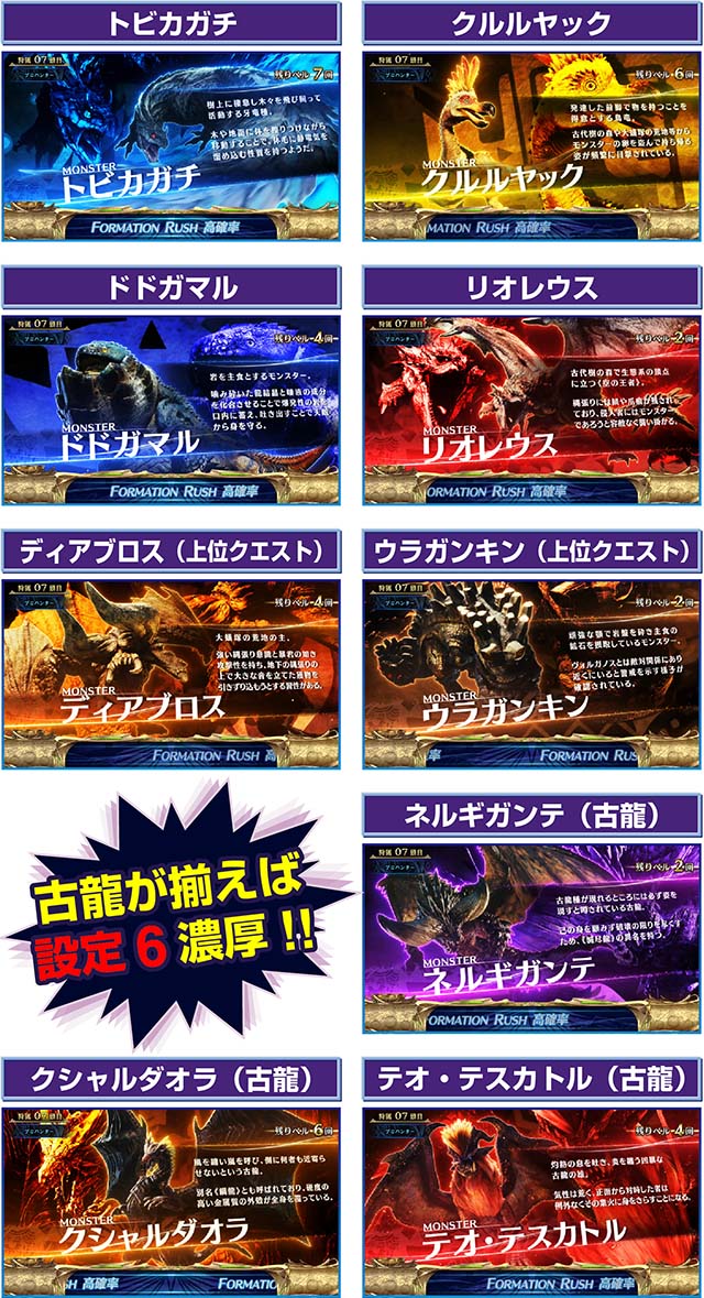 モンスターver.にネルギガンテがいれば設定2否定で、古龍種のテオ・テスカトル&クシャルダオラも一緒ならば設定6濃厚だ。