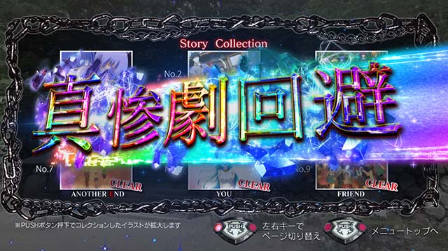 メニュー画面の遊技履歴にある「Story Collection」のイラストをコンプリートすると、設定4以上ならば、一度だけ“惨劇回避”の文字が出現する可能性あり。