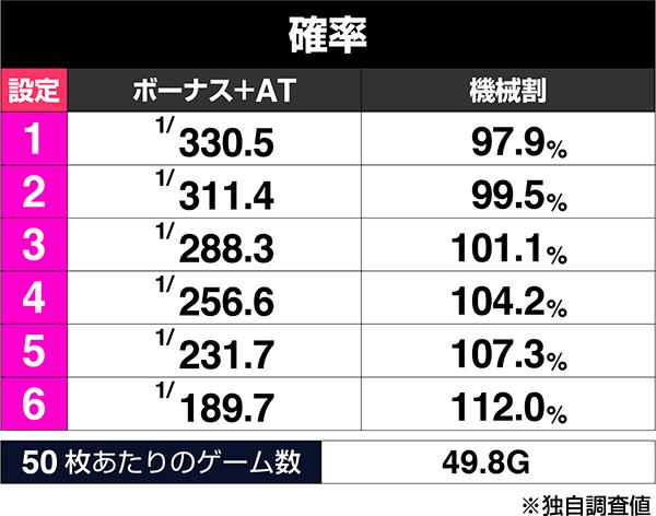 ATの純増は約5枚/Gと高い出玉性能が魅力で、50回以上の振り分けは約10%。ベルナビの最大回数である100回なら800枚以上を獲得できる。