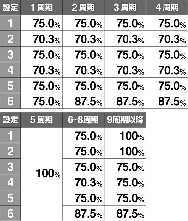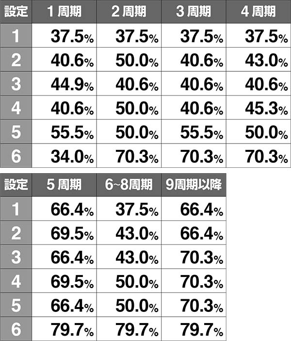 設定6はモードがすべて通常だったとしても、5周期以上ハマる割合は2.7%。7周期以上だと0.1%なので、5周期以上ハマった時点で設定6の可能性は低くなる。