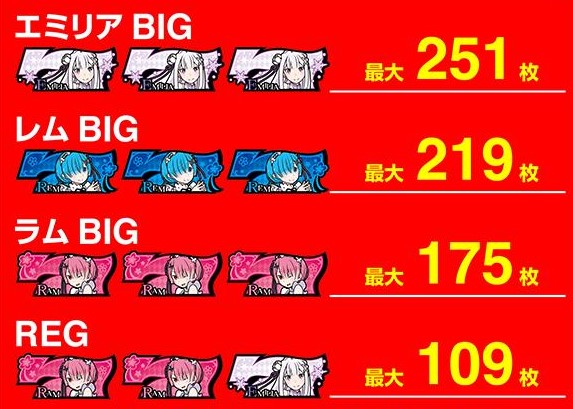 エミリアBIG・レムBIG・ラムBIGの3種類のBIGは、それぞれ獲得枚数とボーナス後の移行先が異なります。まずは、獲得枚数からご覧いただきましょう。