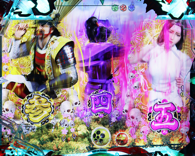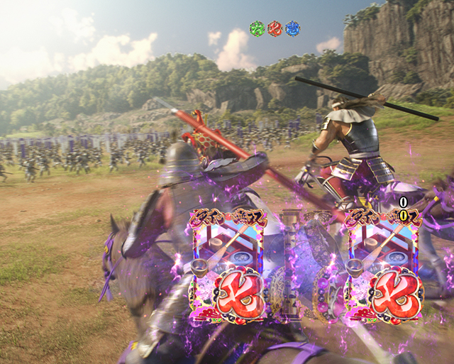 4つの背景ステージではパターン共通でボタン保留から朱槍が色昇格させることも。百花繚乱モードのみカード状の保留の色・キャラ・文字で信頼度が変化。