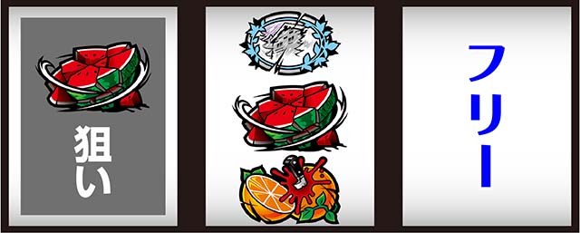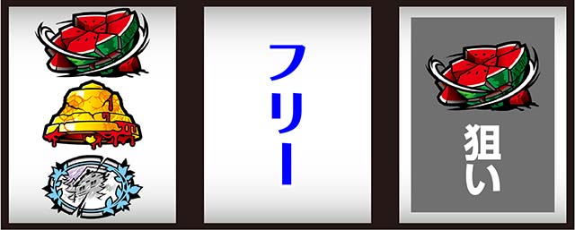 中リールでだけスイカをこぼす可能性があるので、スイカをフォロー。右リールはフリー打ちでOK。スイカがハズれればチャンス目(ベルの中段ズレ目)となる。