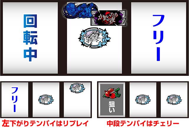 かまいたちボーナスはBIGより枚数が多いうえ、終了後は真・運命分岐モードへ突入。