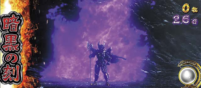 通常時の紫7絵柄揃いから突入する「呀バトル」に勝利すれば、AT「魔戒RUSH」へ突入。前半の“陰我終結の刻準備”で保留をストックし、後半の“陰我終結の刻”勝利を目指す2パートで構成されています。