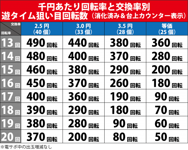 交換率と千円あたりの回転率に応じた、遊タイムの狙い目回転数は下表の通り。