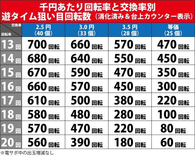 交換率と台の回転率に応じた狙い目回転数は下表の通り。